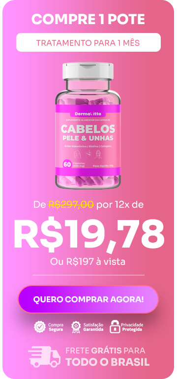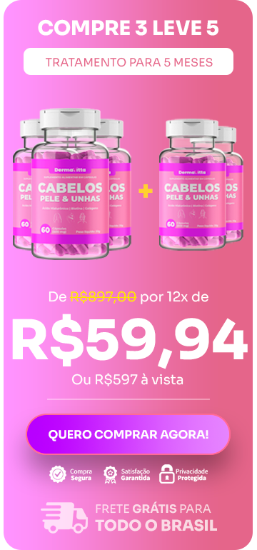 Diferente dos tratamentos convencionais que oferecem resultados apenas temporários, o Dermavitta age profundamente de dentro para fora. Sua fórmula avançada reúne 9 ativos essenciais em alta concentração, aliados à tecnologia de encapsulamento que garante máxima absorção pelo organismo. Essa combinação estimula a produção natural de colágeno, fortalece unhas, devolve a vitalidade e o volume dos cabelos e mantém a pele jovem, firme e radiante por muito mais tempo.